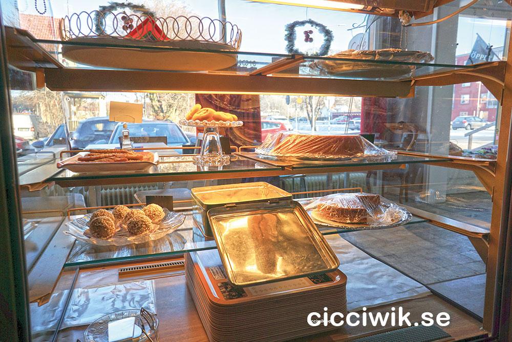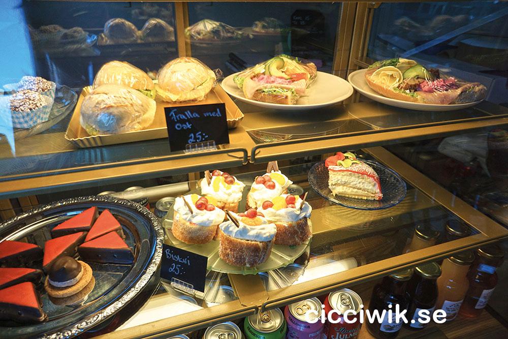 I glasdisken vid kassan står flera smörgåsar, kakor, tårtbitar. Kaffe får kunden servera sig själv intill kassan. Någon mat lagar de inte i köket som finns bakom disken.