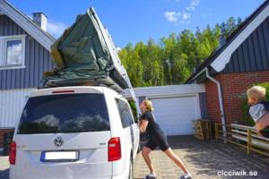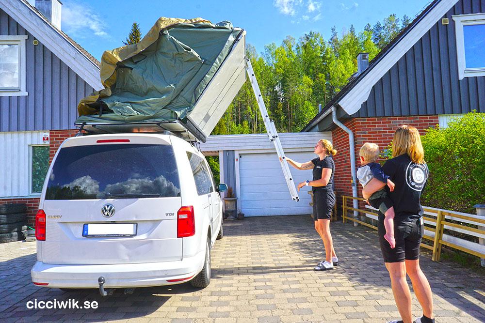 På familjens bil, som är en Volkswagen, är ett takttält monterat just den här lördagen när Värmlandsbygden är på besök. Theresé och Nathalie har redan varit ute på en premiärtur första helgen i maj och tältet får sitta kvar. Nathalie visar hur det går till att fälla ut det och det tar kanske fem minuter.